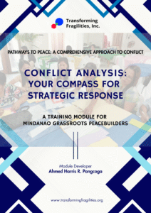 Developed by Ahmed Harris R. Pangcoga, this Conflict Analysis: Your Compass for Strategic Response module was developed by Transforming Fragilities, Inc. (TFI) as a comprehensive training resource for Mindanao grassroots peacebuilders. The module equips participants with analytical frameworks and practical tools to understand, map, and address the underlying causes and dynamics of conflict. It provides a structured learning journey—from foundational concepts to applied analysis and strategic action—enabling participants to design informed, conflict-sensitive interventions that promote sustainable peace in the Bangsamoro and other fragile contexts.