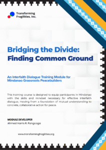 Developed by Ahmed Harris R. Pangcoga, this Interfaith Dialogue Training Module titled “Bridging the Divide: Finding Common Ground” was developed by Transforming Fragilities, Inc. (TFI) for Mindanao grassroots peacebuilders. The module equips participants with the mindset and practical tools necessary for engaging in meaningful interfaith dialogue that moves from mutual understanding to collaborative action for peace. Structured as a three-day course, it integrates learning of the head, heart, and hands, guiding participants from personal empathy-building to skill application and community action. It reflects TFI’s mission of transforming fragilities into strengths by fostering authentic respect and cooperation among diverse faith communities in Mindanao.