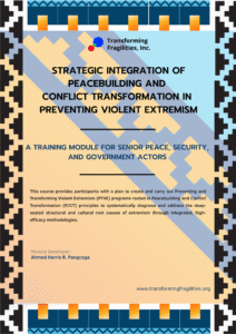 Developed by Ahmed Harris R. Pangcoga, this training module on the Strategic Integration of Peacebuilding and Conflict Transformation (PB-CT) in Preventing Violent Extremism (PVE) was developed by Transforming Fragilities, Inc. (TFI) for senior peace, security, and governance actors. Designed as a four-day intensive course, it provides a comprehensive framework for integrating PB-CT principles into Preventing and Transforming Violent Extremism (PTVE) programming. The module equips participants with analytical tools and methodologies to address the structural and cultural root causes of extremism, moving beyond conventional security measures. It serves as both a conceptual and practical guide for institutions seeking to embed non-kinetic, peace-driven strategies within their PTVE and governance mandates.